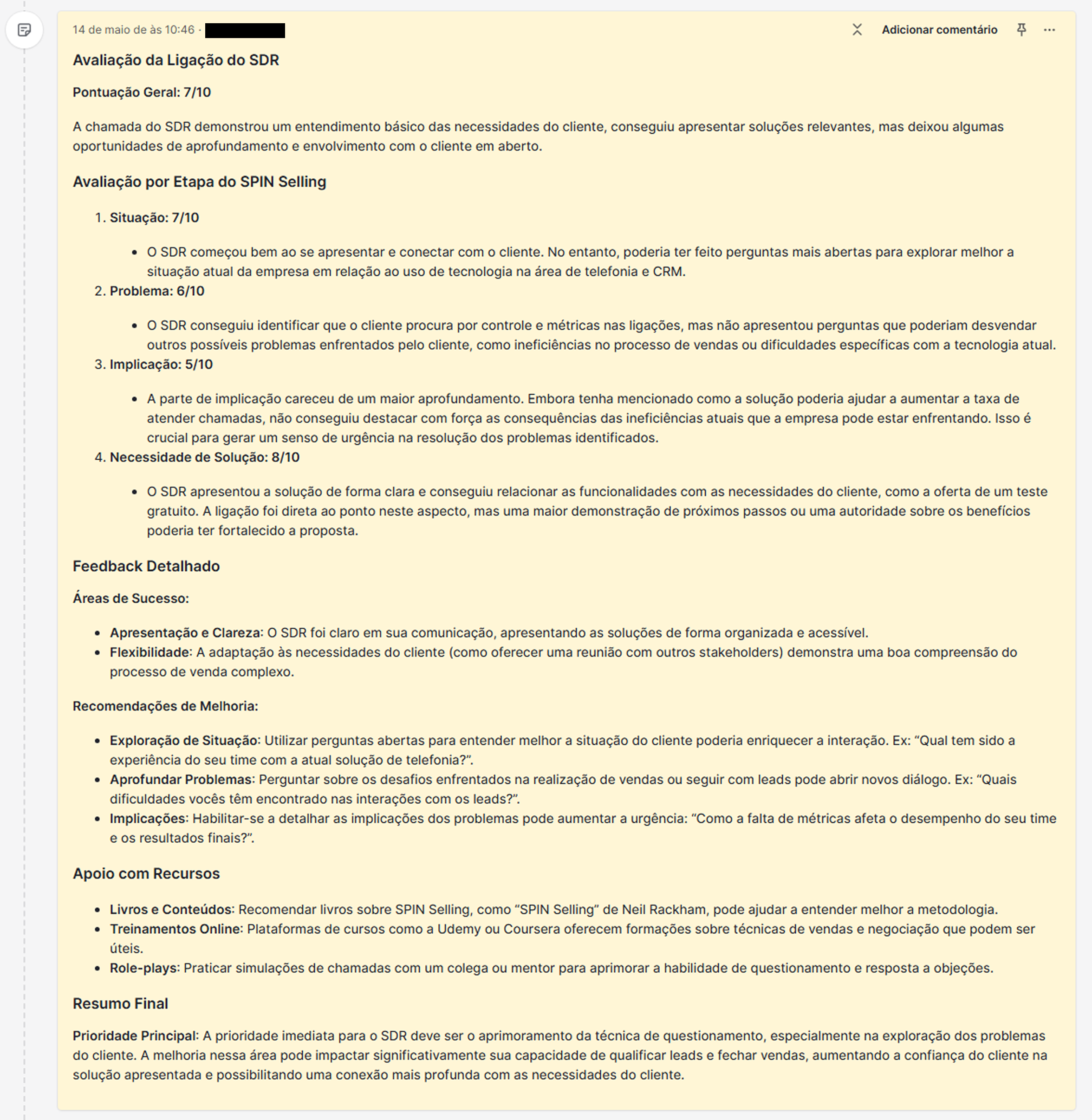 Criamos uma ferramenta que avalia a performance da call com base nas metodologias SPIN e BANT, amplamente usadas em vendas B2B.