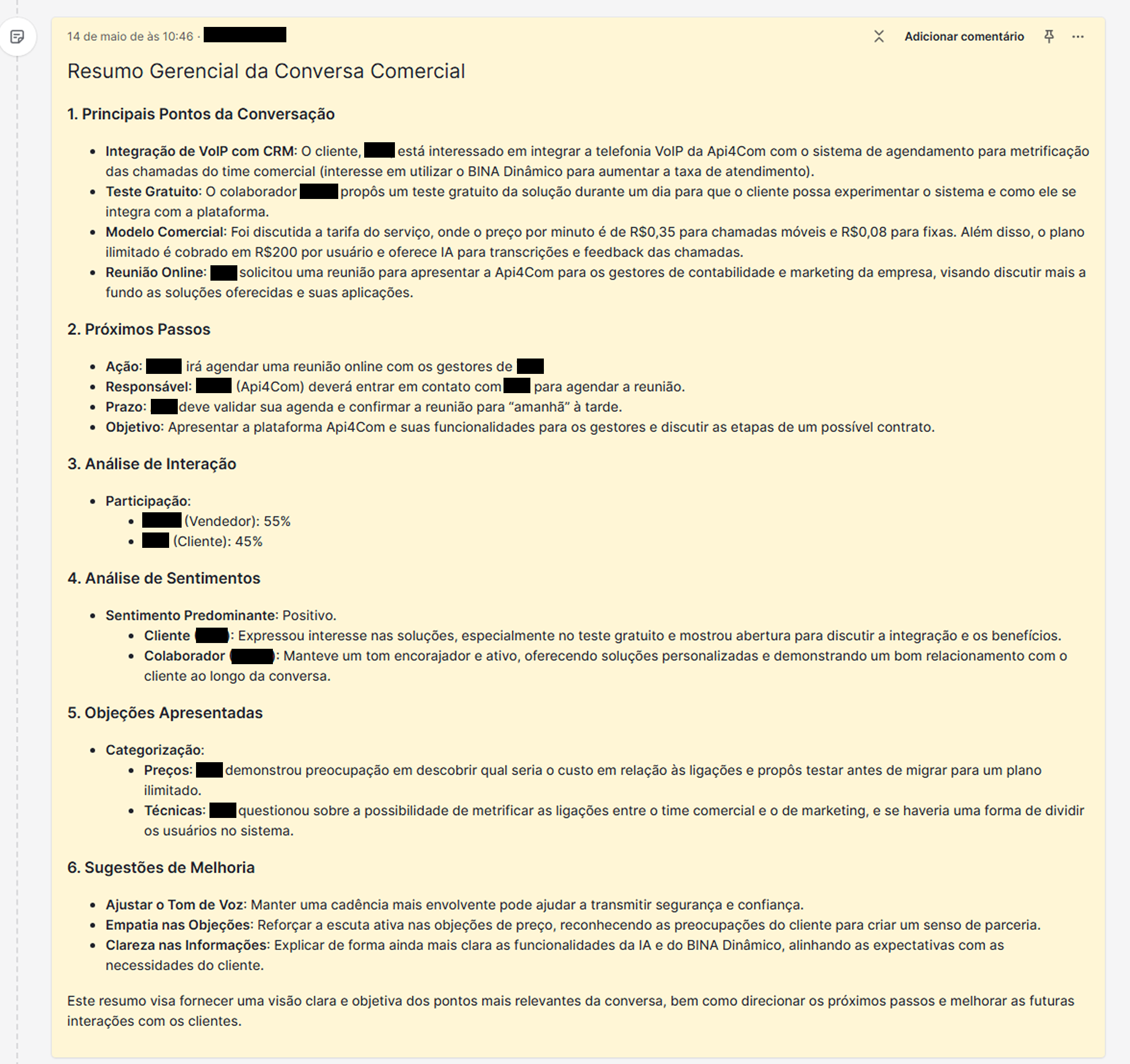A funcionalidade gera um resumo estruturado da conversa, que serve tanto para o vendedor se preparar pro follow-up, quanto para o gestor entender rapidamente se os pontos-chave da qualificação foram cobertos.