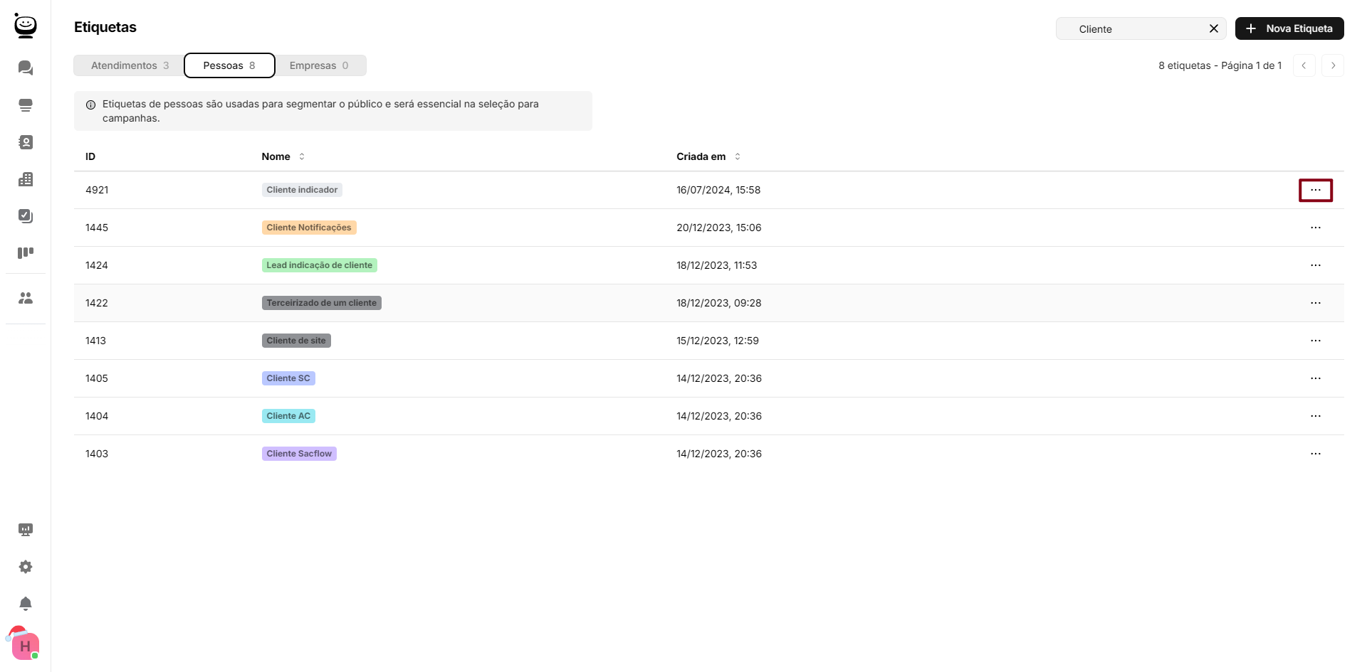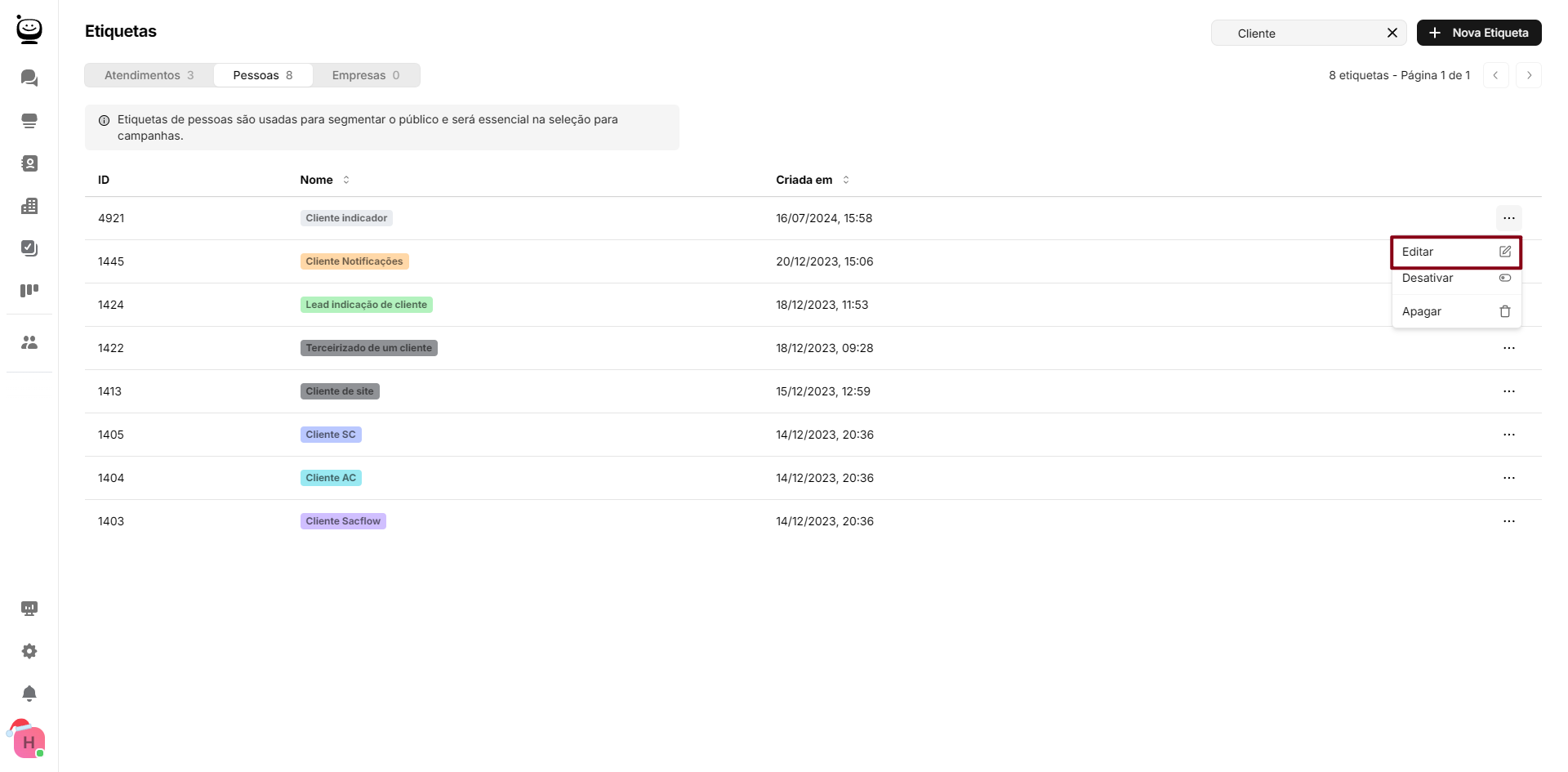 Editar etiquetas permite ajustar informações importantes, como nome, cor ou categoria, garantindo que elas continuem alinhadas às estratégias de organização e atendimento.